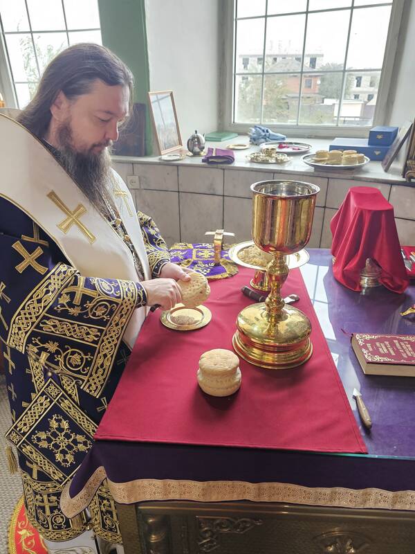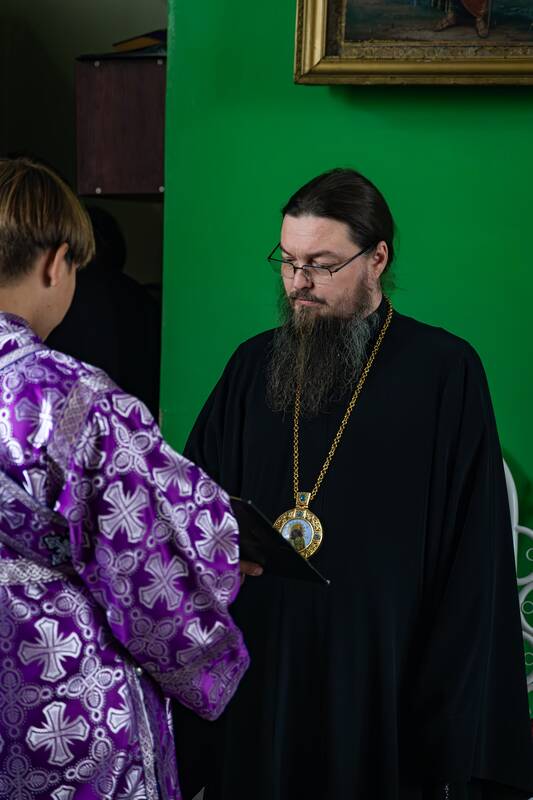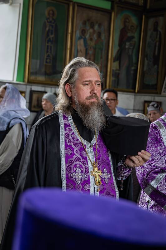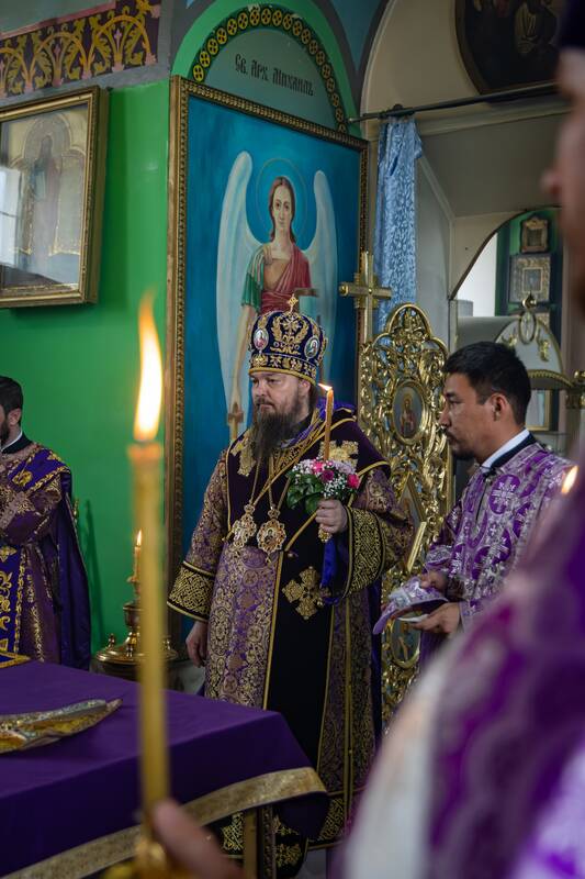 Его Преосвященству сослужили: ключарь Свято-Успенского кафедрального собора г.Атырау, иеромонах Варфоломей (Мостовщиков), клирик Благовещенского храма г.Актау, иерей Михаил Соколов, клирик кафедрального собора Михаила Архангела г.Уральска, иерей Андрей Александров, клирик кафедрального Свято-Успенского кафедрального собора г.Атырау, иерей Александр Ермаков, клирик кафедрального собора Михаила Архангела г.Уральска, иеродиакон Арсений (Рыбальченко), клирик кафедрального Свято-Успенского собора г.Атырау, диакон Богдан Муликов.