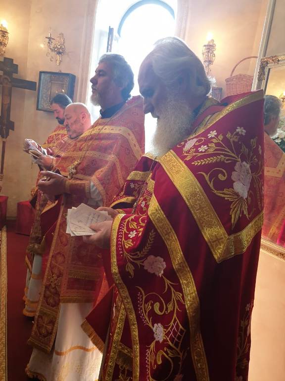 По окончании литургии Его Высокопреосвященство и служащее духовенство совершили крестный ход вокруг и храма и совершили славление пред иконой свт. Николая чудотворца.