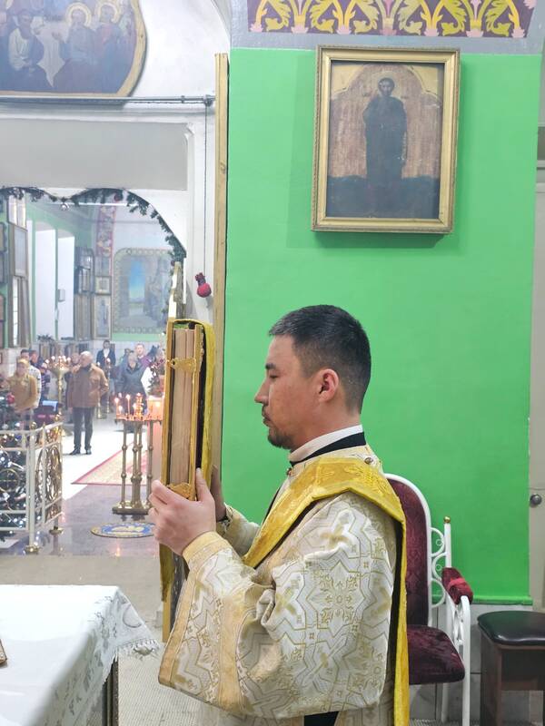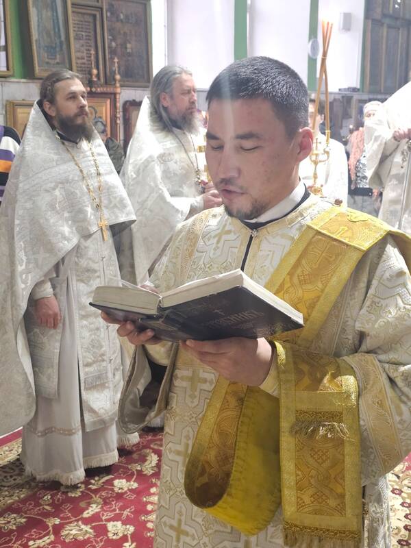 Его Преосвященству сослужили: ключарь Свято-Успенского собора города Атырау иеромонах Варфоломей (Мостовщиков), клирик храма Благовещения Пресвятой Богородицы города Актау, иерей Михаил Соколов, клирик кафедрального собора Христа Спасителя г.Уральска, иерей Анатолий Гиляшев, клирик Свято-Успенского собора города Атырау, иерей Александр Ермаков, клирик кафедрального собора Христа Спасителя г.Уральска, протодиакон Иоанн Рошка, клирик Свято-Успенского кафедрального собора г.Атырау, диакон Богдан Муликов.