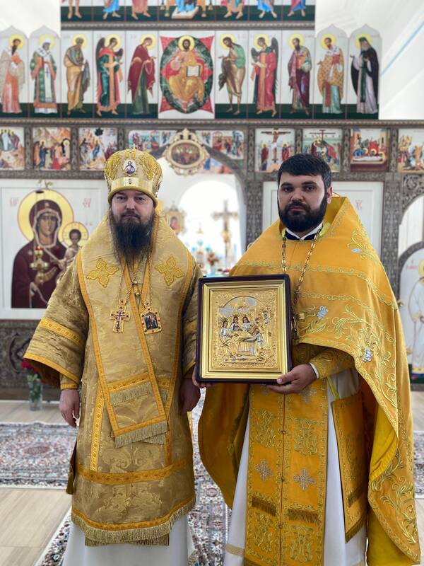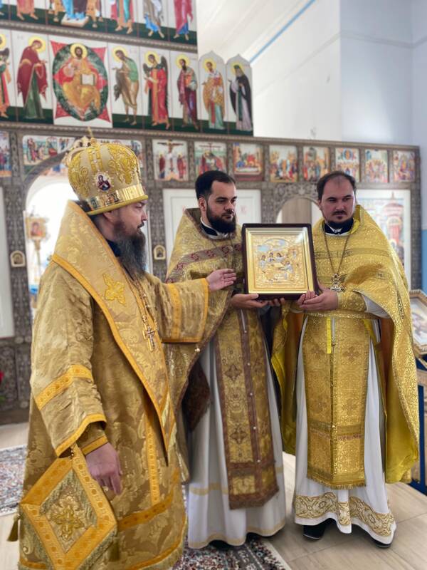 Владыка Вианор подарил храму икону "Святой Троицы" и преподал архипастырское благословение, окропив молящихся освящённой водой.