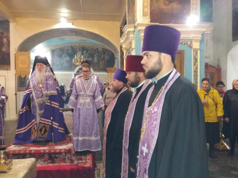 Его Высокопреосвященству сослужили: Благочинный Уральского округа архимандрит Дионисий (Козулев), благочинный Приурального округа протоиерей Владимир (Гарасим), духовник Покровского женского монастыря г. Уральска игумен Стефан (Капинос), секретарь Уральской епархии архидиакон Василий (Крюков), клирики кафедрального собора.