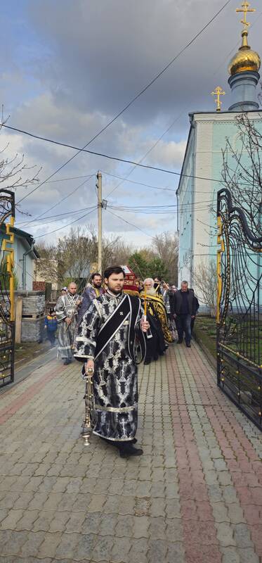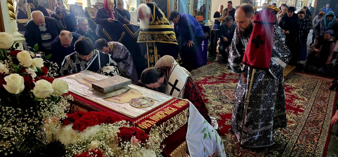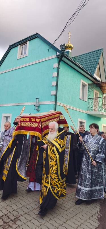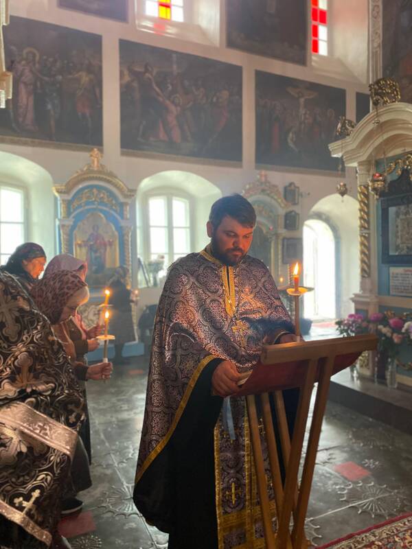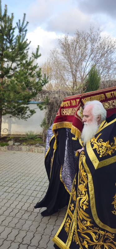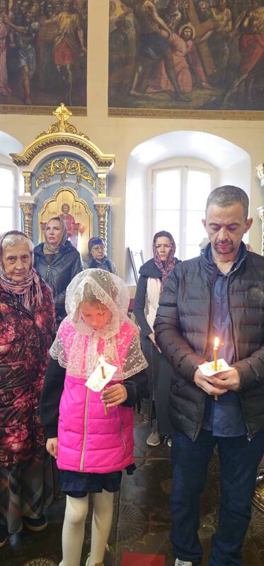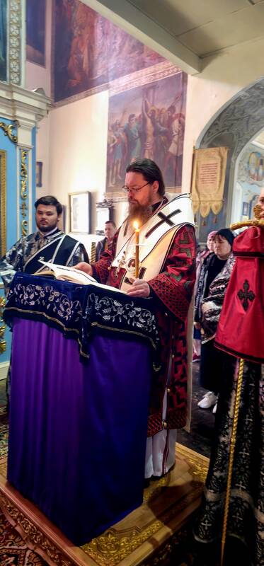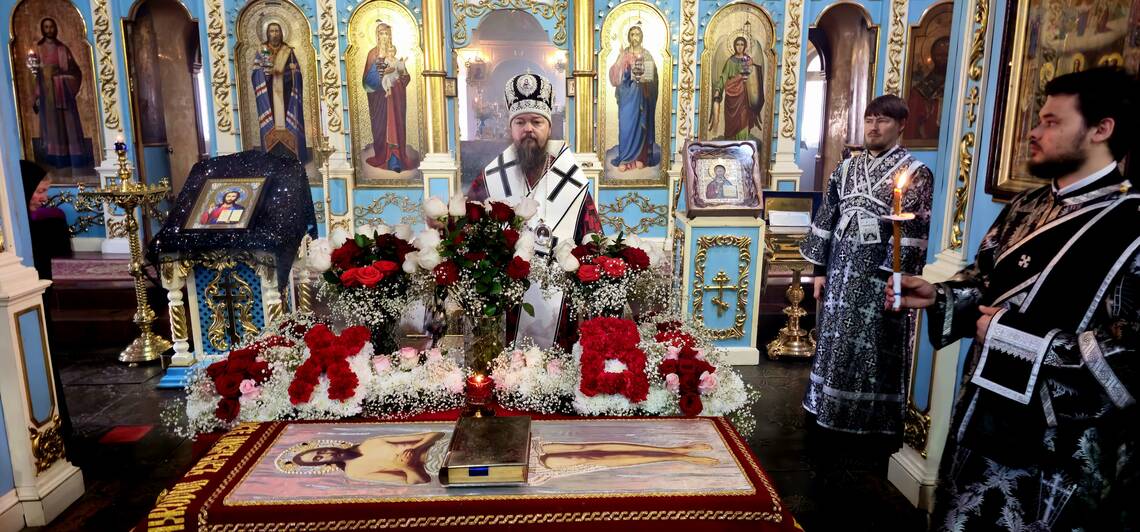 В завершение вечерни, при пении тропарей «Благообразный Иосиф...», в преднесении возженных свечей и при каждении фимиамом, с Престола, как бы с Голгофы, епископ Вианор и священнослужители вынесли из алтаря изображение положения Христа во гроб – святую Плащаницу. Вышитая пелена с иконой погребения Спасителя возложена на украшенной цветами гробнице в центре храма; по бокам установлены кацеи (кадильницы) с горящим углем и фимиамом.