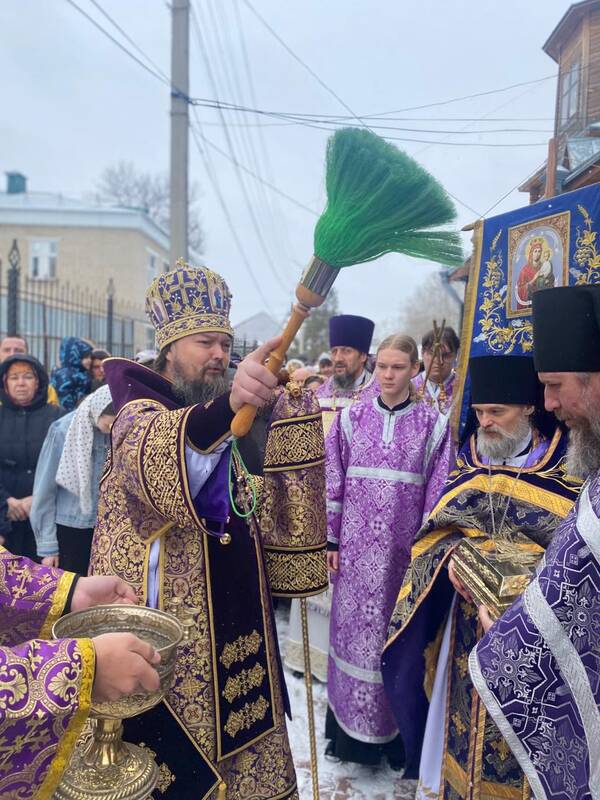 По заамвонной молитве был совершен праздничный Крестный ход вокруг храма с частицей мощей праведной Матроны Московской, с славлением и молитвенным обращением ко святой старице Московской. В завершении владыка прочитал Святое Евангелие и окропил молящихся освящённой водой.