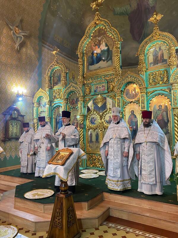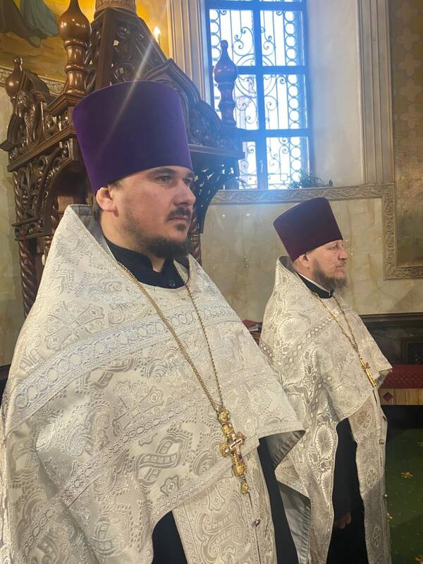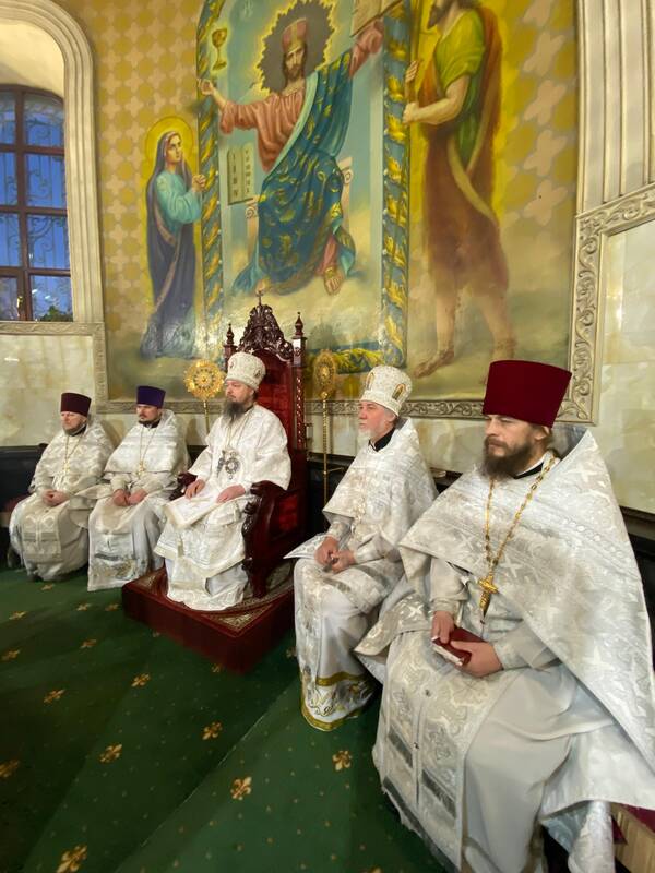 Его Преосвященству сослужили: настоятель кафедрального собора Христа Спасителя г.Уральска, протоиерей Анатолий Робу, клирики кафедрального собора Христа Спасителя-протоиерей Василий Кроитор, иерей Анатолий Гиляшев, настоятель храма Трёх Святителей п.Чапаево, иерей Алексий Потапов, клирик кафедрального собора Христа Спасителя г.Уральска, протодиакон Иоанн Рошка.