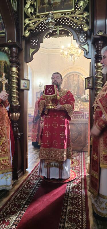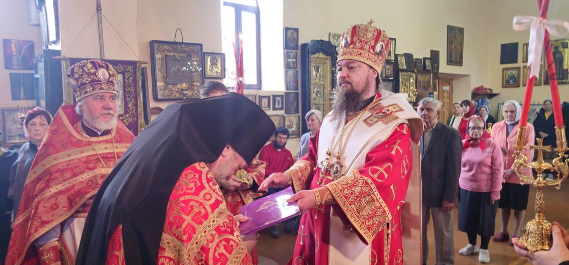 На малом входе указом Святейшего Патриарха Кирилла за усердное служение Святой Церкви Его Преосвященство наградил настоятеля Свято-Никольского храма г.Уральска, игумена Илию (Данилейко) с правом служения Божественной литургии с отверстыми царскими вратами до «Отче наш».