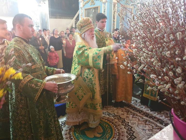 По отпусте Литургии состоялось славление – хор и духовенство исполнили тропарь, кондак и величание празднику Входа Господня в Иерусалим.