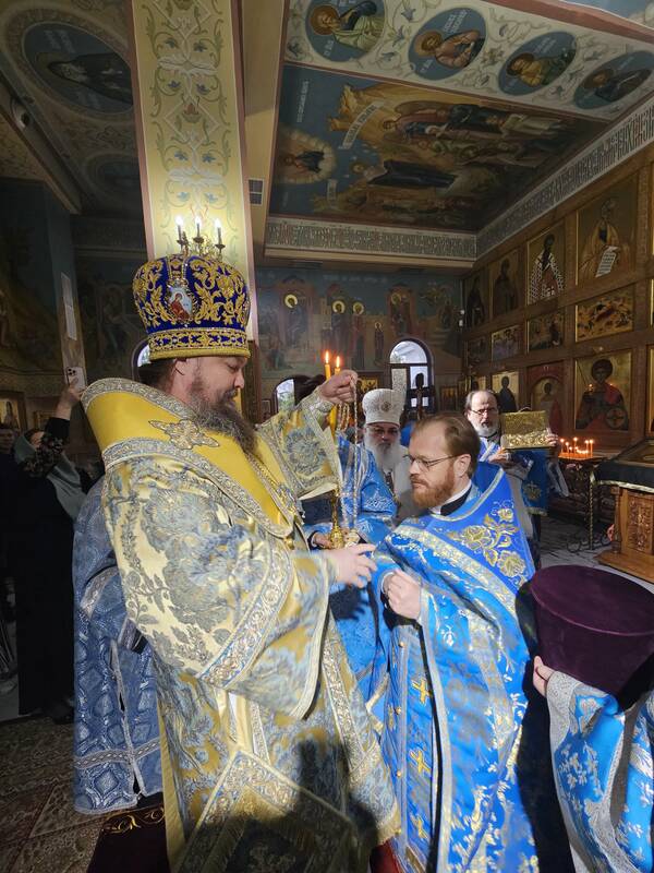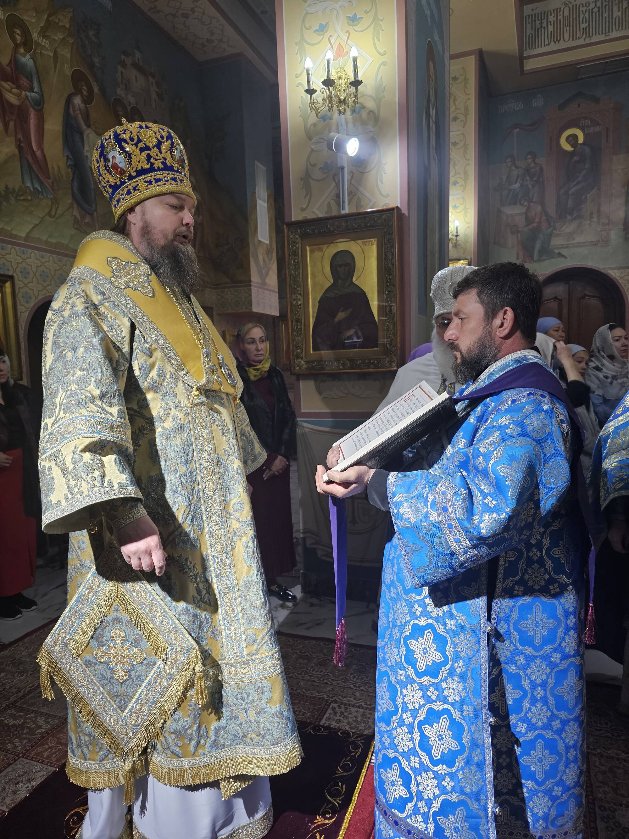 На малом входе, по благословению Патриарха Московского и всея Руси Кирилла, настоятель Благовещенского храма г.Актау протоиерей Сергий Понич был награждён правом ношения Креста с украшением, управляющий Уральской епархией епископ Вианор возложил награду достойному пресвитеру.