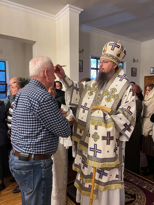 На полиелее Его Преосвященство помазал верующих освящённым елеем.