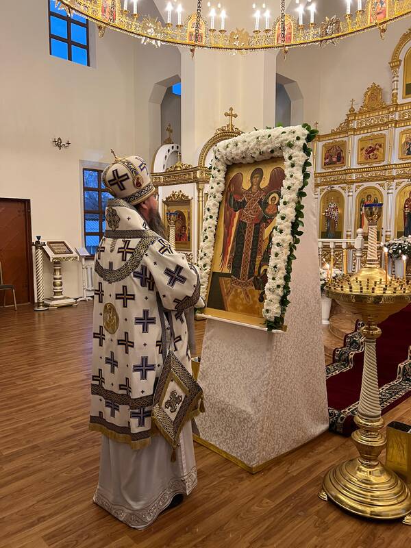 В этот юбилейный год когда храму исполнилось 125 лет со дня основания богослужение собрало духовенство и многочисленных прихожан, прибывших помолиться вместе со своим архипастырем. Перед началом службы Владыка Вианор приветствовал духовенство и паству, призвав всех к единению в молитве и благодарению Бога за Его милости и предстательство Архистратига Михаила — небесного покровителя храма.