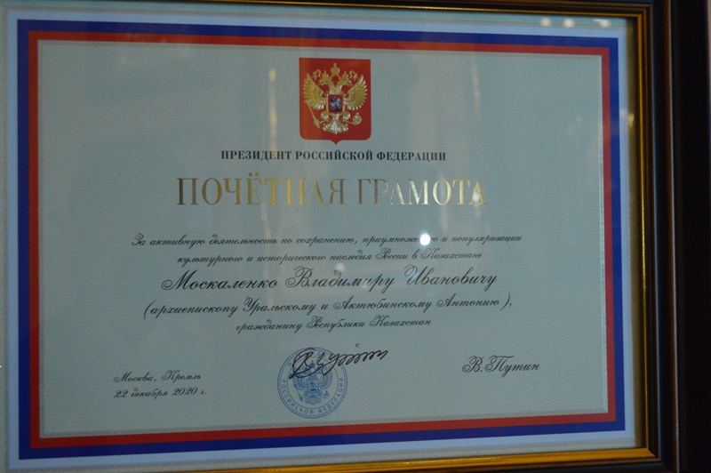 Генеральный консул Российской Федерации в Уральске Андрей Кимович Батманов преподнес архиепископу Уральскому и Актюбинскому Антонию почетную Грамоту от Президента Российской Федерации В.В. Путина. И серебряный нагрудный знак.