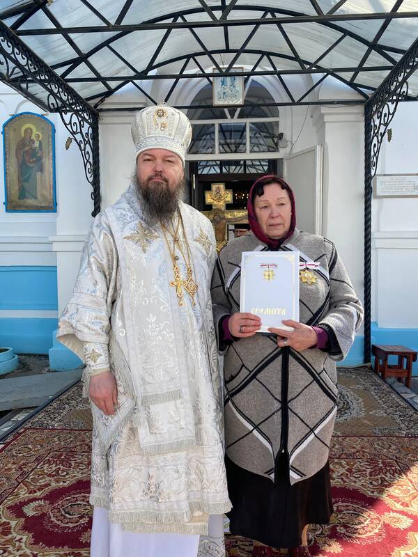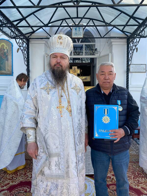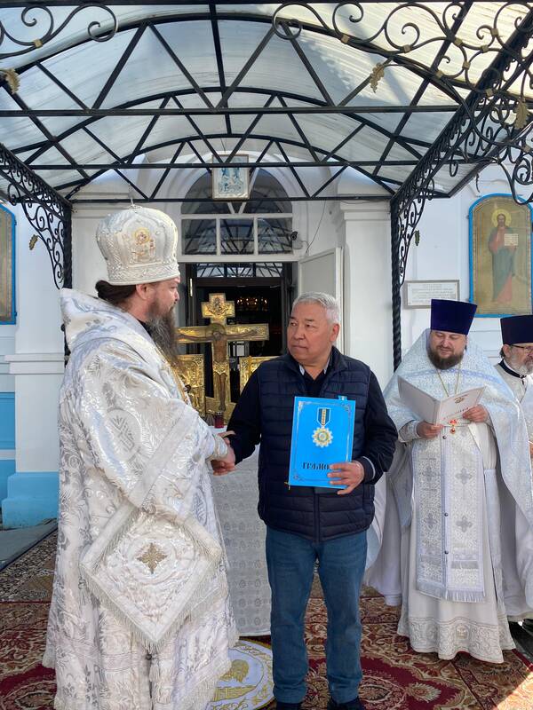 В завершении Богослужения Его Преосвященство за усердные труды наградил благодетеля - Джаныбекова Мурадыма Кадыровича, генерального директора ТОО Ритуал Орал - орденом "Енбек Ушiн", (За труды), и бухгалтера Спасо-Пребраженского храма г.Уральска Кабанову Ольгу Васильевну - орденом мчч. Веры, Надежды, Любови и матери их Софии, с напутственными словами Божей помощи и благословением от Всевышнего на всякое доброе дело.