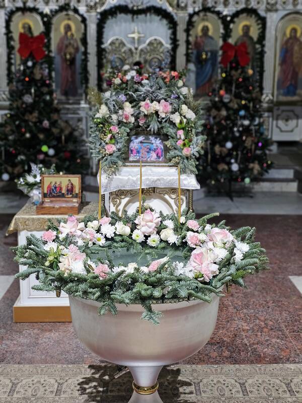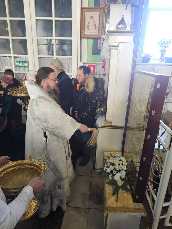 После окропления великой агиасмой (богоявленской святой водой) храма и молящихся, духовенство и певчие исполнили тропарь и кондак праздника перед иконой Крещения, символизирующей свет Христова учения, Божественное просвещение, даруемое в Богоявлении.
