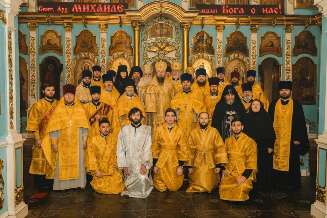 Его Преосвященству сослужили: настоятель кафедрального собора Михаила Архангела г.Уральска, архимандрит Феодосий ( Курьянов), настоятель кафедрального собора Христа Спасителя г.Уральска, протоиерей Анатолий Робу, клирик Покровского женского монастыря г.Уральска, архимандрит Дионисий (Козулев), благочинный Уральского округа протоиерей Владимир Гарасим, благочинный Приурального округа протоиерей Василий Кроитор, настоятель Свято-Никольского храма г.Уральска, игумен Илия ( Данилейко), ключарь Свято-Успенского кафедрального собора г.Атырау, иеромонах Варфоломей (Мостовщиков), настоятель храма Казанской иконы Божией Матери с.Дарьинское, протоиерей Георгий Лемачко, руководитель информационного отдела Уральской епархии, игумен Дорофей (Дильманаев), настоятели и клирики Уральского и Приурального благочиний. Диаконский чин возглавил клирик кафедрального собора Христа Спасителя г.Уральска, протодиакон Иоанн Рошка.