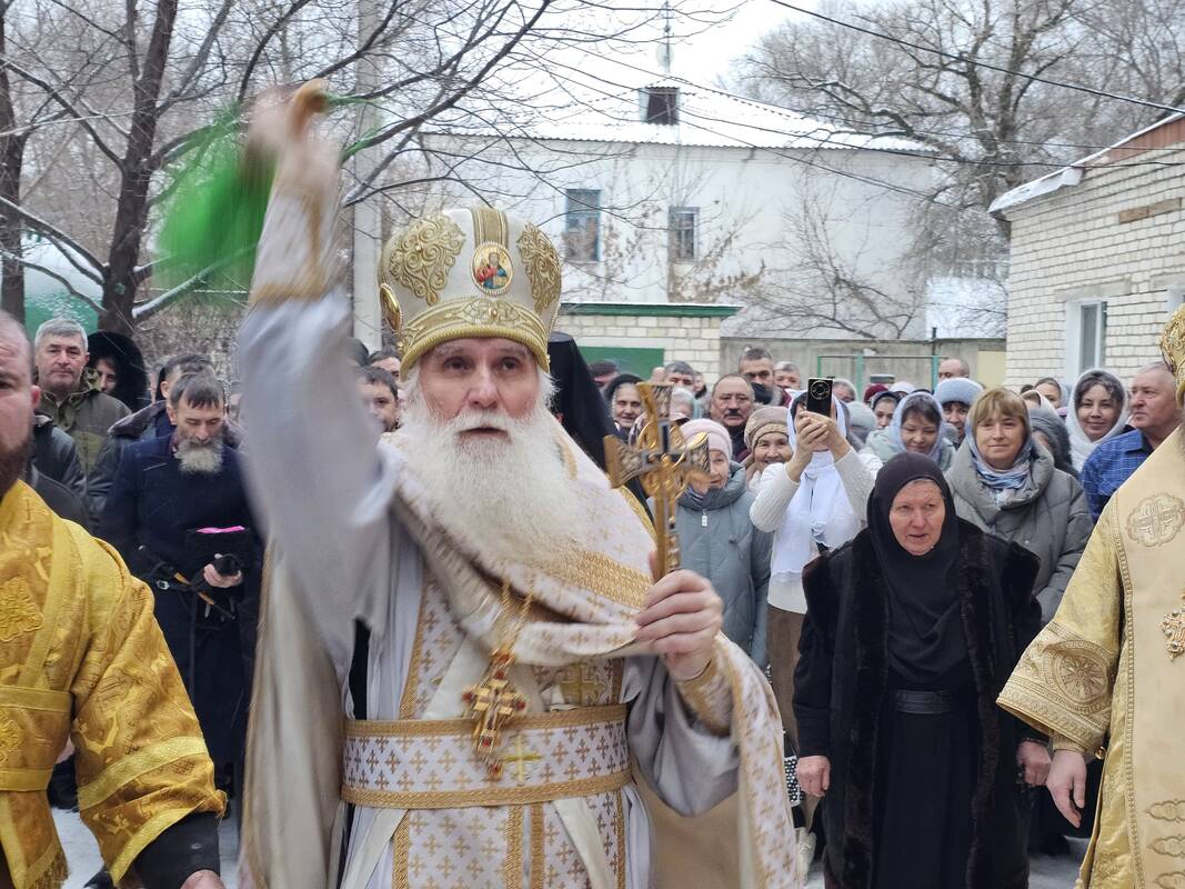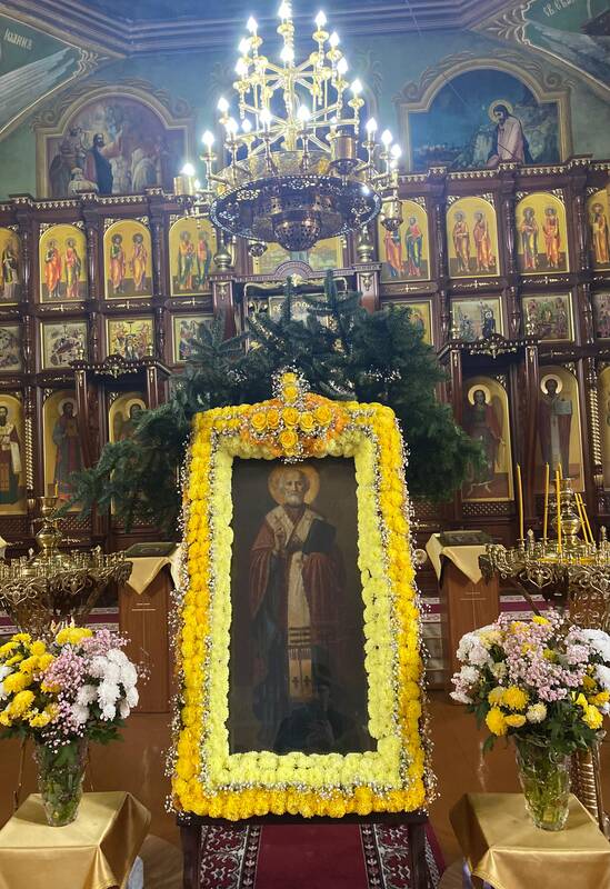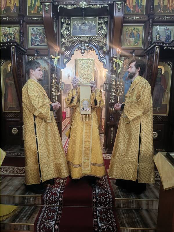 По заамвонной молитве был совершен праздничный Крестный ход вокруг храма, владыка Вианор окропил молящихся освящённой водой и прочитал молитву Святителю Николаю Мир Ликийскому чудотворцу.