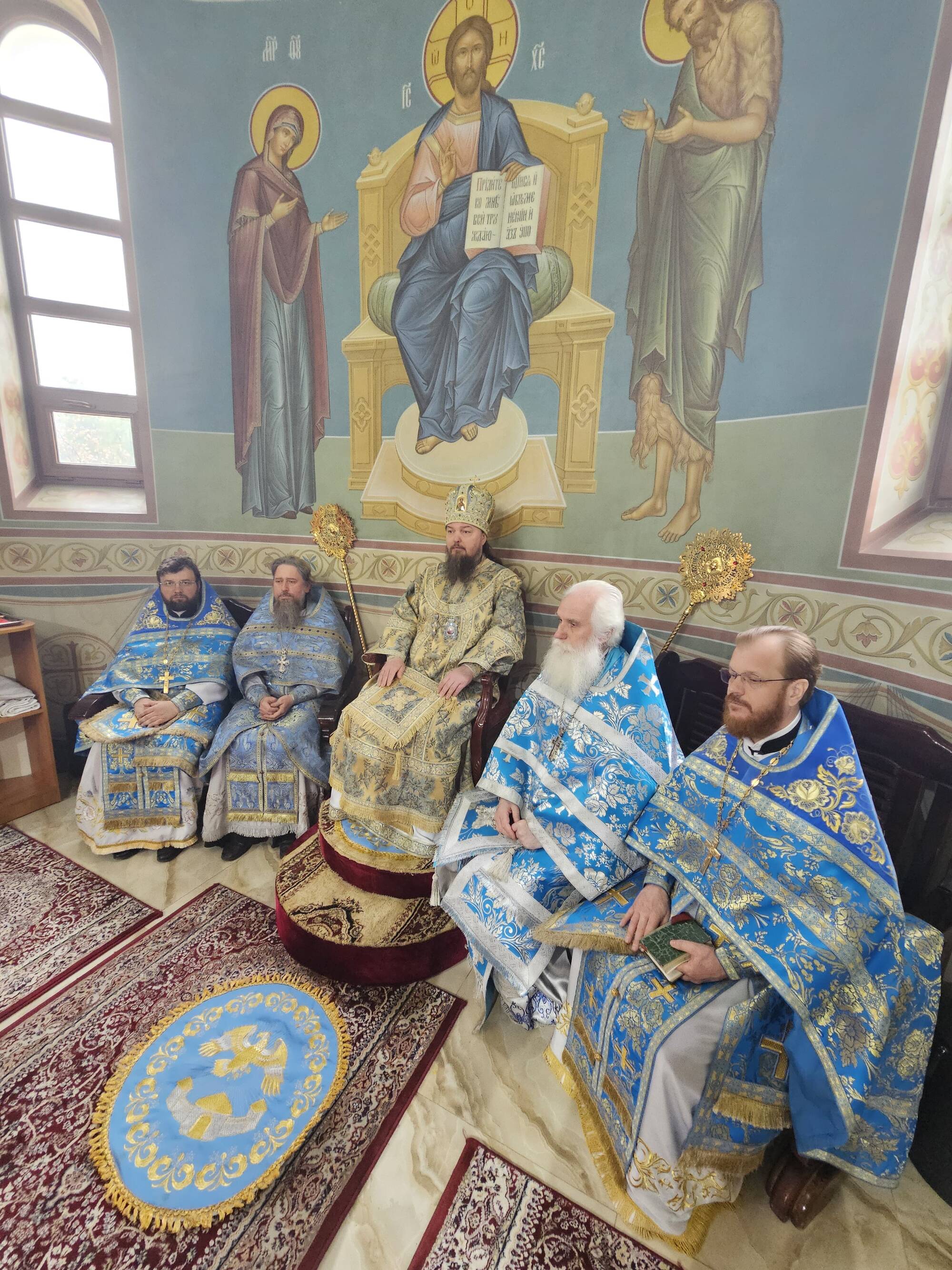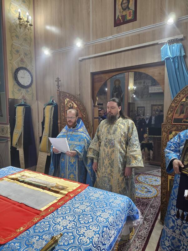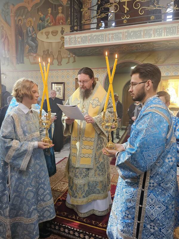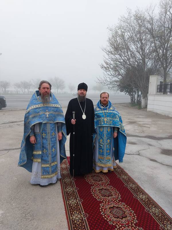 Его Преосвященству сослужили: настоятель кафедрального собора Михаила Архангела г.Уральска архимандрит Феодосий ( Курьянов); ключарь кафедрального Свято-Успенского собора г.Атырау иеромонах Варфоломей (Мостовщиков); настоятель Благовещенского храма г.Актау протоиерей Сергий Понич; клирик Благовещенского храма г.Актау иерей Михаил Соколов; клирик кафедрального собора Христа Спасителя г.Уральска протодиакон Иоанн Рошка, клирик кафедрального собора Михаила Архангела г.Уральска иеродиакон Арсений (Рыбальченко).
