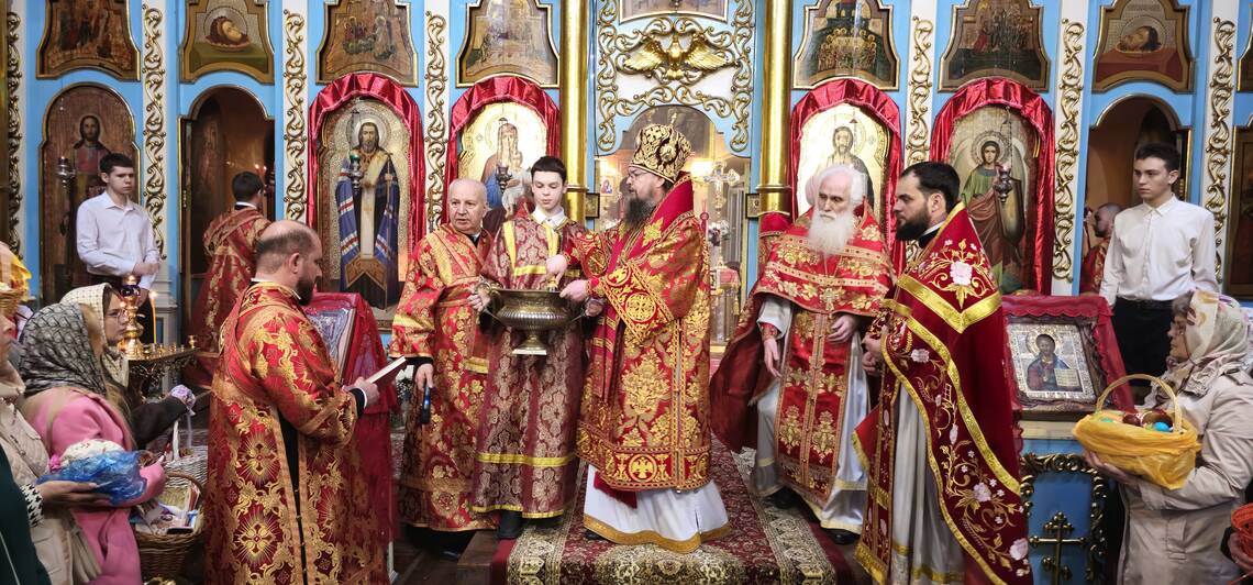 По заамвонной молитве Его Преосвященство освятил Артос и прочитал молитвы на освящения пасхальных явств.